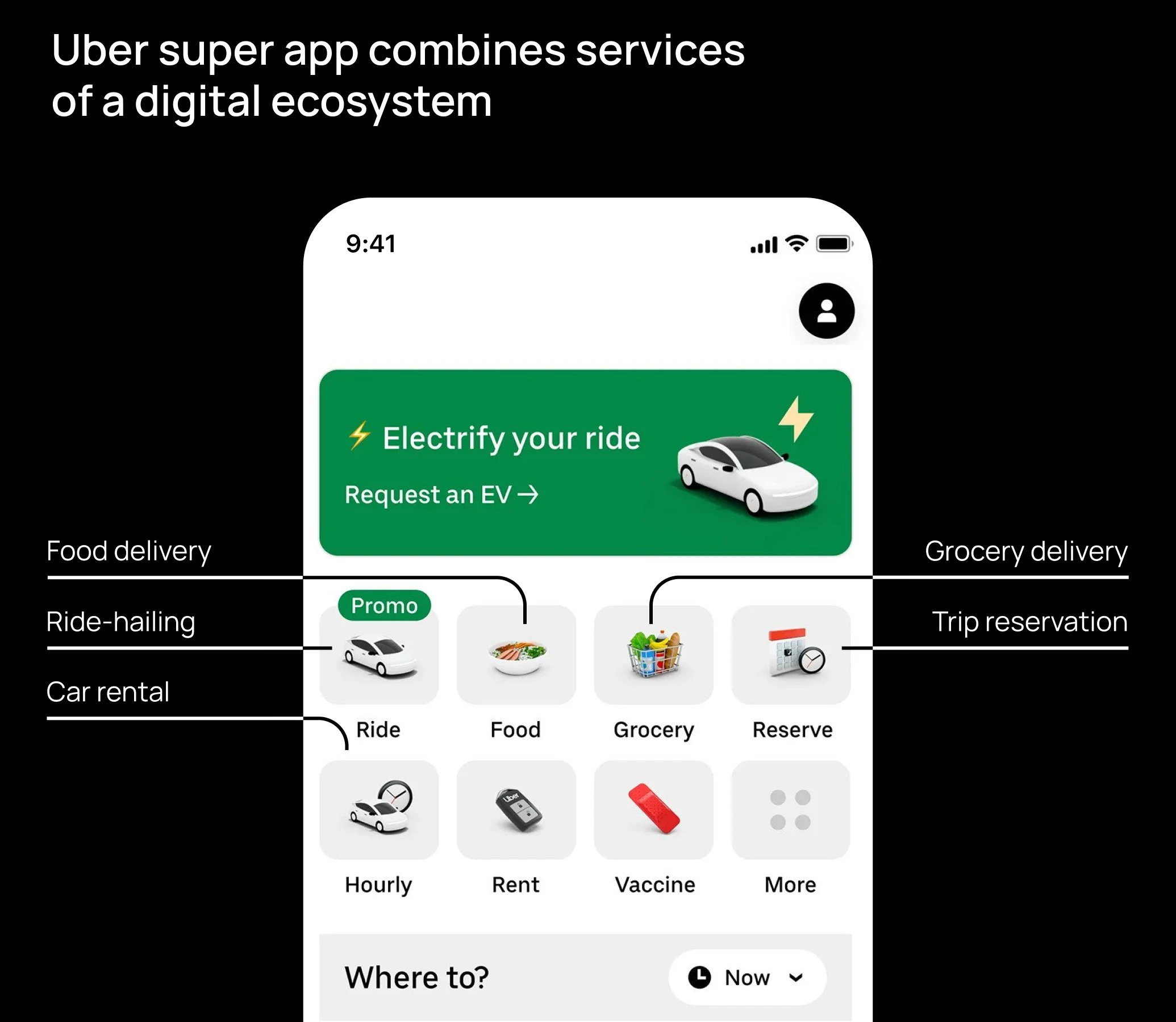 Example. Uber is a mobility ecosystem that branched out its ride-hailing business into food and package delivery, booking, couriers, and freight transportation. The services grow from mutual promotion and a shared client base. As of 2022, Uber holds 72% of the U.S. ride-hailing market, and 24% of shares for food delivery.